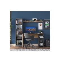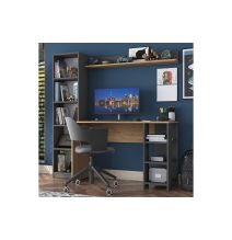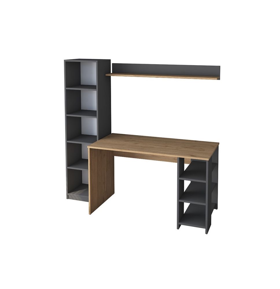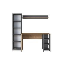 Espacio de Trabajo y Almacenamiento Incluye un escritorio en color antracita con una librería natural incorporada. Los estantes están diseñados para la organización abierta de libros, accesorios y decoraciones, ofreciendo tanto funcionalidad como un toque decorativo. Este diseño multifuncional maximiza el uso del espacio vertical, ideal para oficinas o habitaciones con espacio limitado.