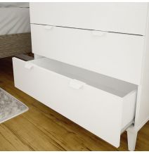 El sinfonier y las mesillas de noche destacan por su construcción en melamina de alta calidad, que garantiza una durabilidad excepcional y resistencia a los impactos diarios. El diseño elegante con estructura en color Cambria y frentes de cajón en color blanco aporta un toque moderno y sofisticado a cualquier dormitorio.